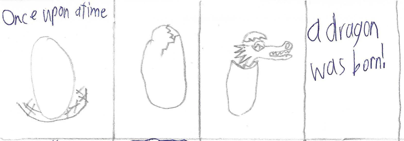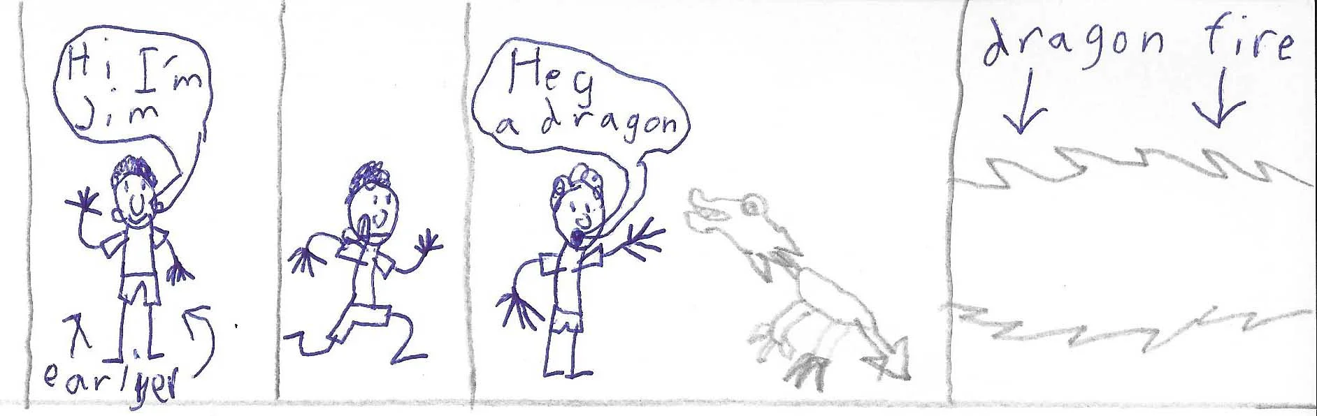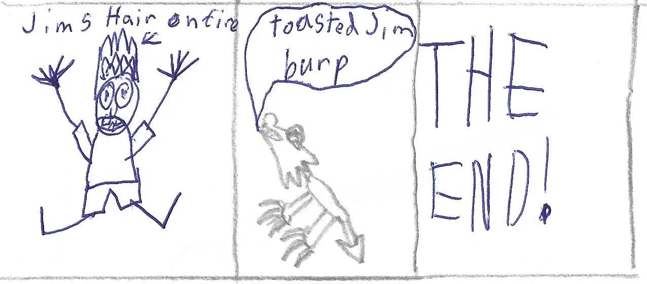 He went all day and was delivered back by dinner. I didn't ask how it went but he came home with a cartoon that he and J had drawn together. They obviously both contributed to the ideas (J's a bit keen on dragons and Bright Eyes is into burps and disaster) and took turns making the art.