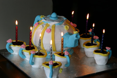 This is the cake for the nine year old. Ambitious, I know, but I fell in love with a teapot in one of the cake decorating books and knew I wouldn't be content until I had done it.
